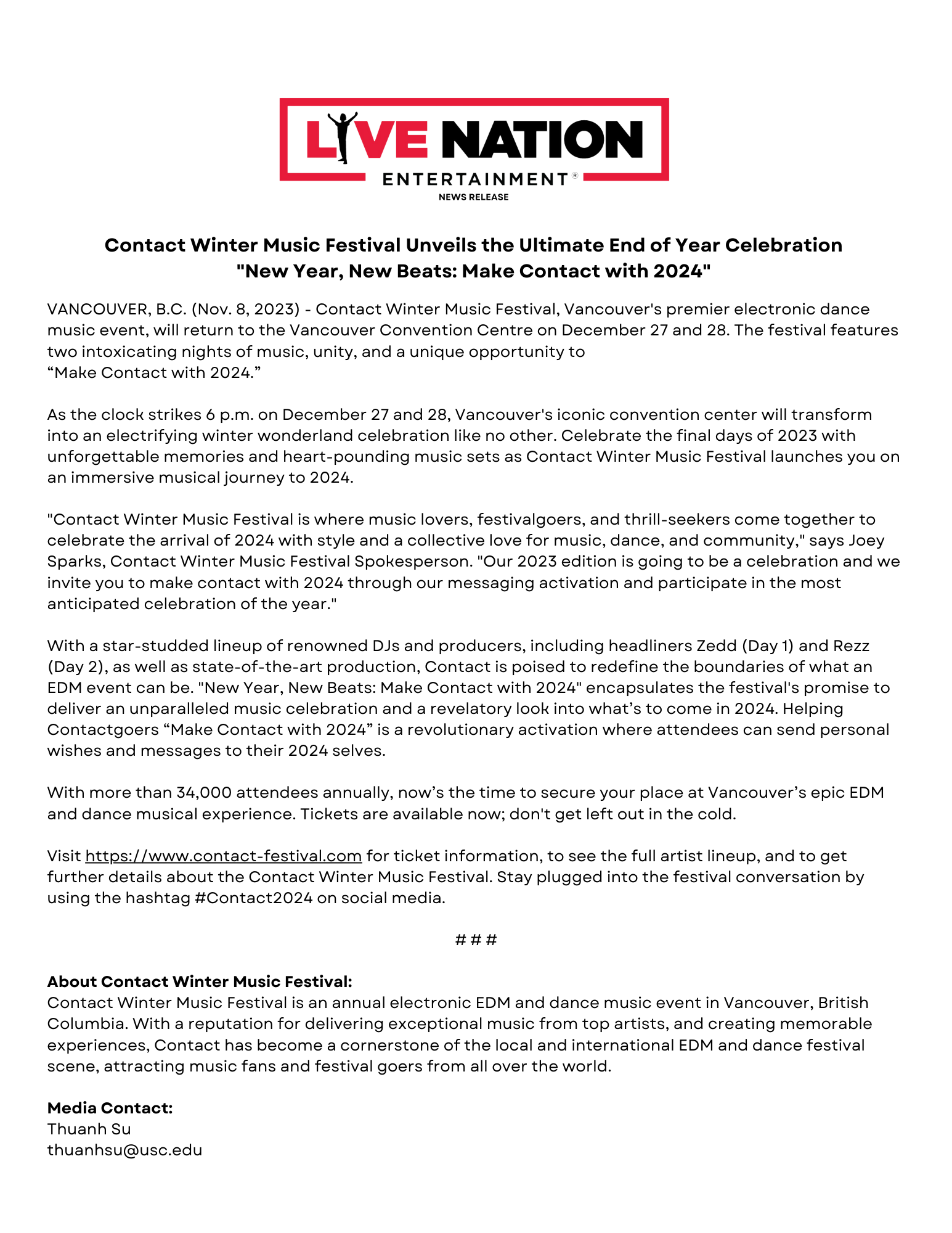 Visit https://www.contact-festival.com for ticket information, to see the full artist lineup, and to get further details about the Contact Winter Music Festival. Stay plugged into the festival conversation by using the hashtag #Contact2024 on social media.